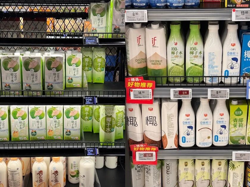 一家在华北拥有18家门店的连锁超市负责人对界面新闻表示,椰子水在2025年卖得很好,今年仍然会做堆头陈列。“这两年大家都在学胖东来,我们也在推自有品牌,比如1L装椰子水,价格在10元左右,销量不错。”
